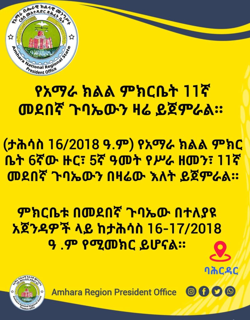 (ታሕሳስ 16/2018 ዓ.ም) የአማራ ክልል ምክር ቤት 6ኛው ዙር፣ 5ኛ ዓመት የሥራ ዘመን፣ 11ኛ መደበኛ ጉባኤውን በዛሬው እለት ይጀምራል።